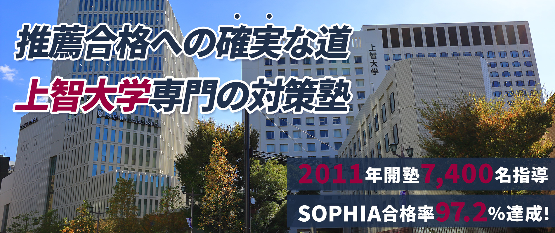 開塾以来、上智大学に圧倒的な指導実績を築き上げ、神学部、文学部、総合人間科学部、法学部、経済学部、外国語学部、総合グローバル学部、国際教養学部、理工学部に多数の逆転合格者を輩出。代表として企画・監修した「上智大学合格プロジェクト」の累計合格率は97.2%を記録する。